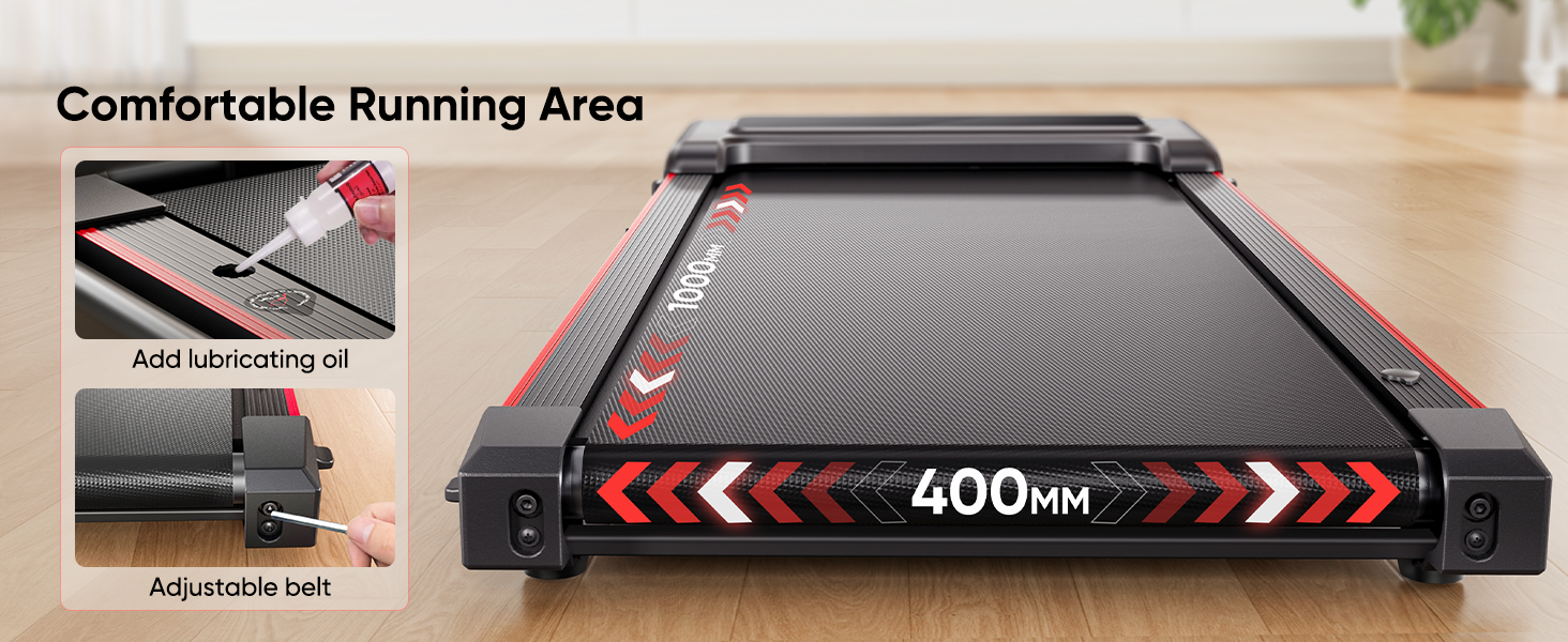 The treadmill has a running surface of 100 x 40 cm. The unique design of the lubrication holes makes maintenance easy.